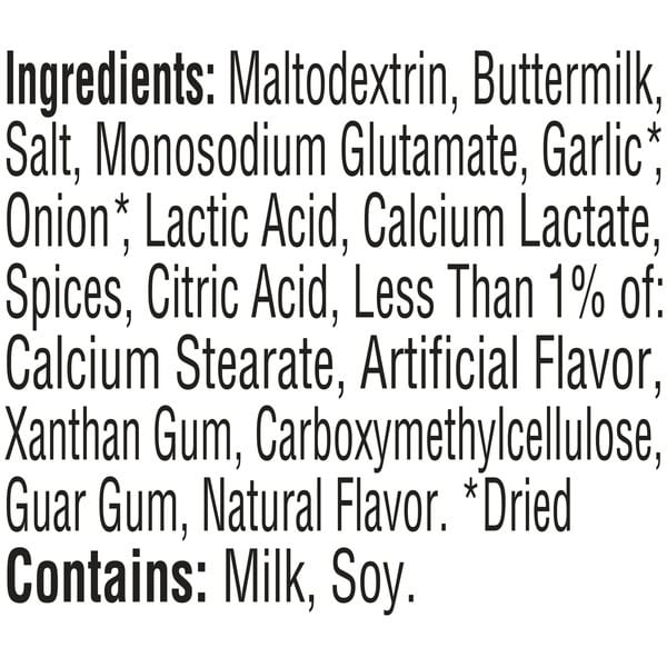 Maltodextrin, Buttermilk, Salt, Monosodium Glutamate, Garlic*, Onion*, Lactic Acid, Calcium Lactate, Spices, Citric Acid, Less Than 1% Of: Calcium Stearate, Artificial Flavor, Xanthan Gum, Carboxymethylcellulose, Guar Gum, Natural Flavor, *dried