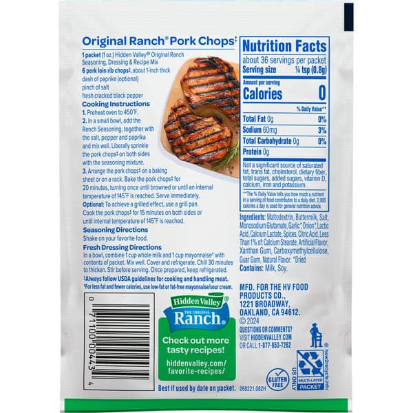 With Hidden Valley Original Ranch Seasoning, Dressing and Recipe Mix, it’s easy to add the cool and zesty taste of ranch to all your favorite foods. Just sprinkle over everything: chicken, pizza, veggies and even savory snacks like popcorn. This ranch seasoning gives you lots of versatility. For creative meal ideas with bold, unique flavors, use this seasoning with its special blend of dry herbs and spices to make delicious entrees and innovative side dishes. This convenient 1 ounce packet is ready to rip open and start cooking, making it perfect to help create a quick meal or snack. Check out the back of the packet for a quick and easy Original Ranch pork chops recipe to get your creative culinary juices flowing. One seasoning, infinite possibilities. (1) Based on IRI unit sales data L52WE 08/25/24 for Hidden Valley Original Ranch.