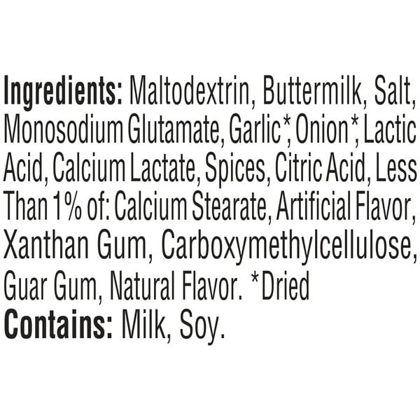 Maltodextrin, Buttermilk, Salt, Monosodium Glutamate, Garlic, Onion*, Lactic Acid, Calcium Lactate, Spices, Citric Acid, Less Than 1% Of: Calcium Stearate, Artificial Flavor, Xanthan Gum, Carboxymethylcellulose, Guar Gum, Natural Flavor, *dried