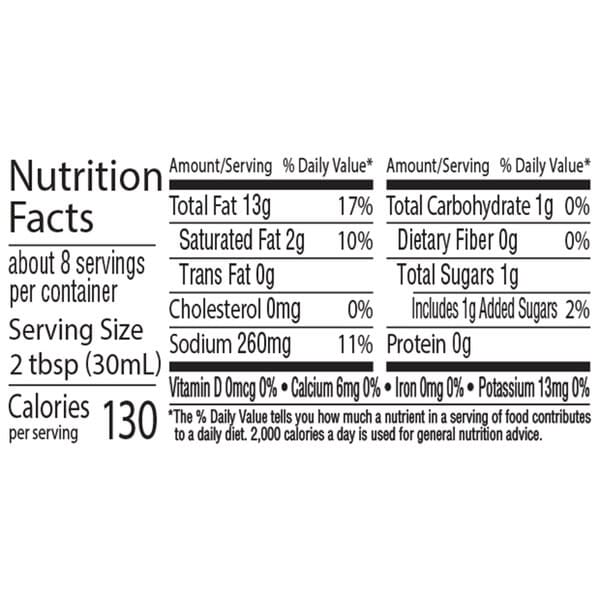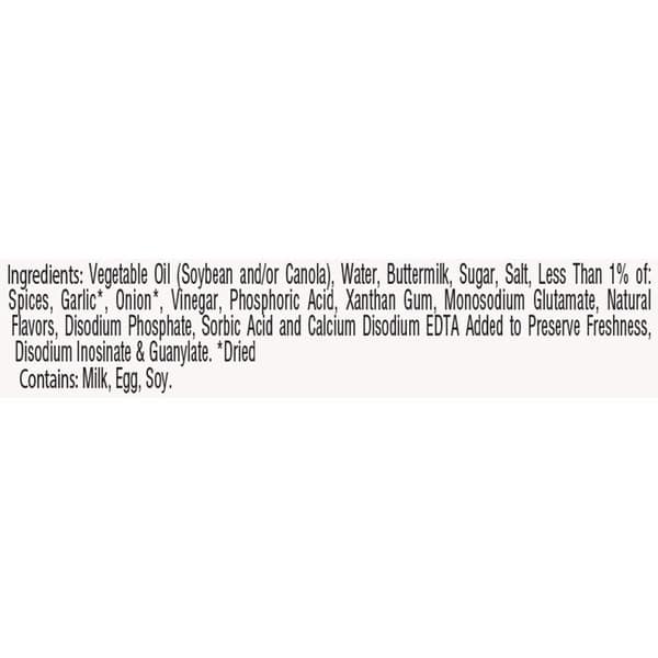 Vegetable Oil (soybean And/or Canola), Water, Buttermilk, Sugar, Salt, Egg Yolk, Less Than 1% Of: Spices, Garlic*, Onion*, Vinegar, Phosphoric Acid, Xanthan Gum, Modified Food Starch, Monosodium Glutamate, Natural Flavors, Disodium Phosphate, Sorbic Acid And Calcium Disodium Edta Added To Preserve Freshness, Disodium Inosinate & Guanylate, *dried