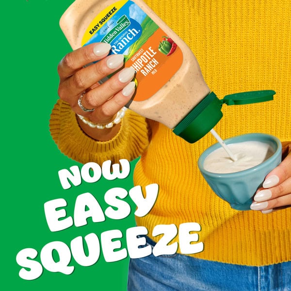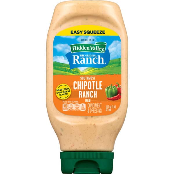 Try a southwest chipotle twist on America’s Favorite Ranch (1). The Hidden Valley Southwest Chipotle Ranch Condiment and Dressing adds a mild chipotle chili flavor to all your favorite foods. This rich and creamy topping is made with real chipotle chili pepper powder and Hidden Valley’s secret blend of herbs and spices, all blended with the irresistible goodness of the ranch you know and crave. Dip, dunk or drizzle it on bowls, salads and more. This keto friendly ranch comes in a no mess easy squeeze bottle. Enjoy the mild flavor of chipotle chili anytime with Hidden Valley Southwest Chipotle Ranch Condiment and Dressing. Real ranch. Real good. (1) Based on IRI unit sales data L52W ending 8/25/24 for Hidden Valley Original Ranch.