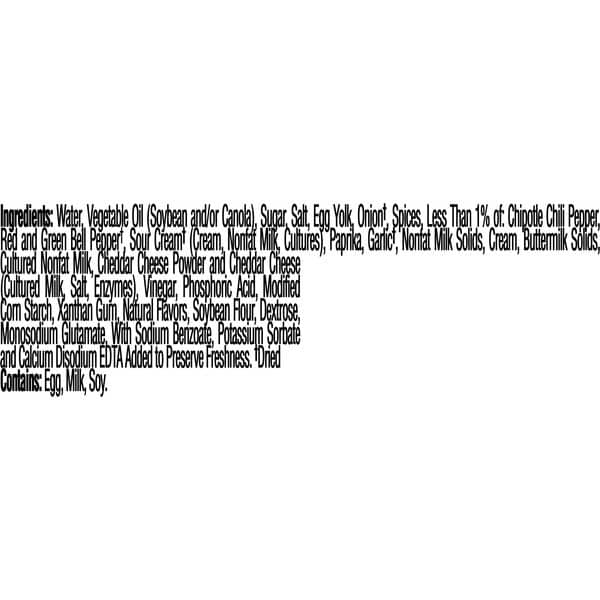 Water, Vegetable Oil (soybean And/or Canola), Sugar, Egg Yolk, Salt, Onion*, Spices, Less Than 1% Of: Chipotle Chili Powder, Red And Green Bell Pepper*, Sour Cream Powder (cream, Nonfat Milk, Cultures), Paprika, Garlic*, Nonfat Milk Solids, Cream, Buttermilk Solids, Cultured Nonfat Milk, Cheddar Cheese Powder And Cheddar Cheese (cultured Milk, Salt, Enzymes), Vinegar, Phosphoric Acid, Modified Food Starch, Xanthan Gum, Natural Flavors, Corn Flour, Dextrose, Monosodium Glutamate, With Sorbic Acid, Potassium Sorbate And Calcium Disodium Edta Added To Preserve Freshness.