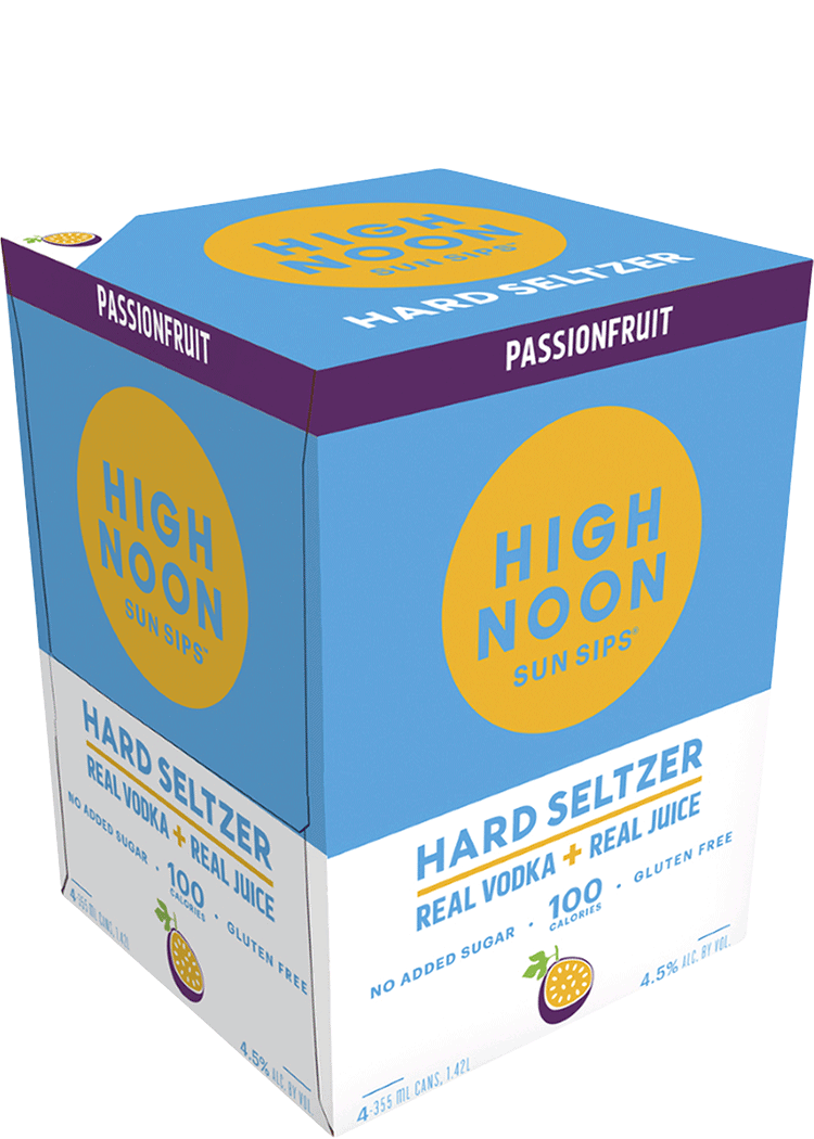 California- Hard Seltzer- 4.5% ABV. High Noon Sun Sips are made with the finest quality Midwest corn and distilled 5 times for smoothness. Real juice and natural flavors blended with vodka and sparkling water. Juicy passionfruit flavor in a crisp, lively sparkling drink.