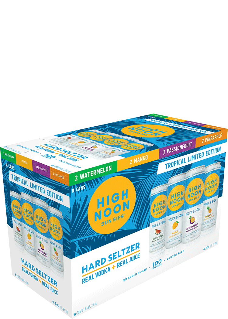 California- High Noon Vodka Hard Seltzers are made with real fruit juice, sparkling water & natural flavors. This crisp and refreshing drink only 100 calories, no added sugar and it’s gluten free. The 8 pack includes 2 cans of each of-watermelon, pineapple, passionfruit, and mango.