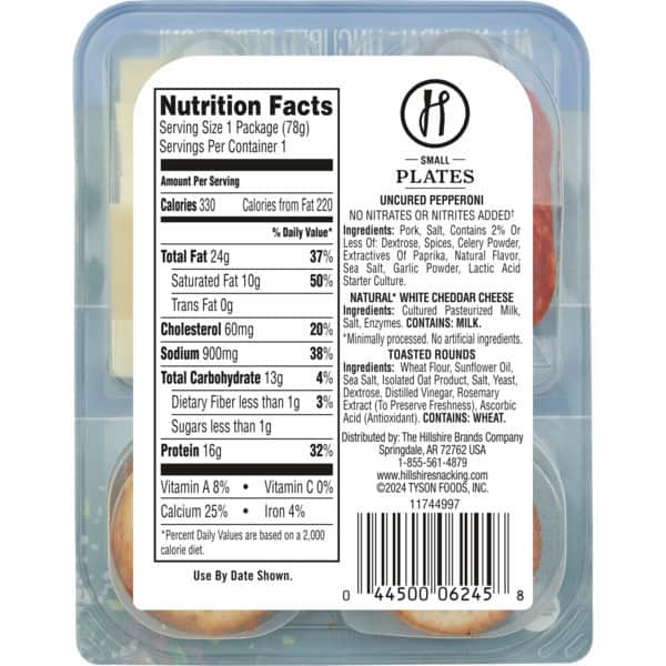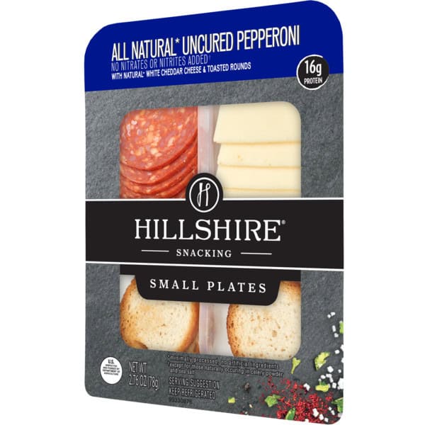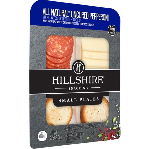 Tender pieces of all natural,* uncured pepperoni, white cheddar cheese slices and toasted rounds come together in this Hillshire Snacking Small Plate. Perfectly portioned for snacking on the go, these pepperoni and cheese snacks have 16 grams of protein in each serving. This single serve pack is the perfect size for tossing in your lunchbox. *Minimally processed, no artificial ingredients
