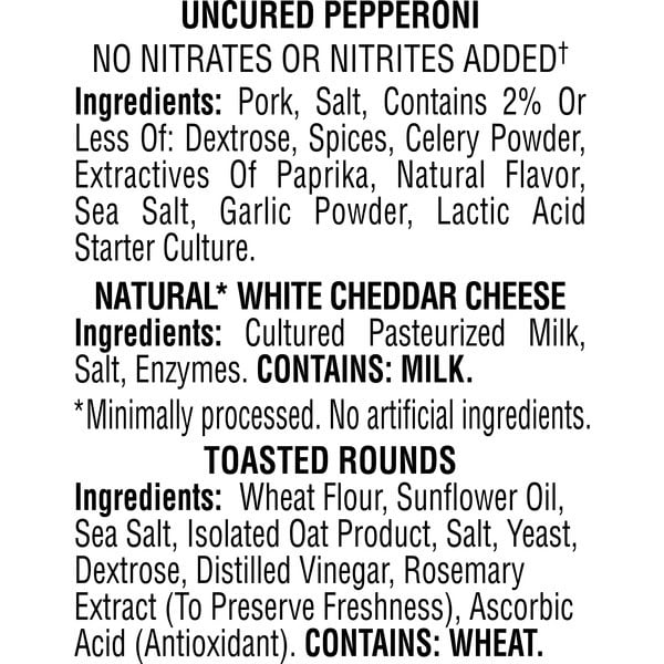 Uncured Pepperoni No Nitrates Or Nitrites Added+ Pork, Salt, Contains 2% Or Less Of: Dextrose, Spices, Celery Powder, Extractives Of Paprika, Natural Flavor, Sea Salt, Garlic Powder, Lactic Acid Starter Culture. Natural* White Cheddar Cheese Cultured Pasteurized Milk, Salt, Enzymes. Contains: Milk. *minimally Processed. No Artificial Ingredients Toasted Rounds Wheat Flour, Sunflower Oil, Sea Salt, Isolated Oat Product, Salt, Yeast, Dextrose, Distilled Vinegar, Rosemary Extract (to Preserve Freshness), Ascorbic Acid (antioxidant). Contains: Wheat.
