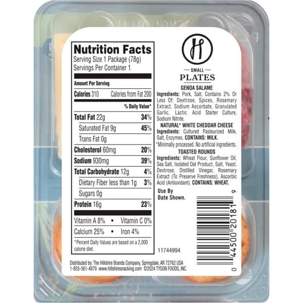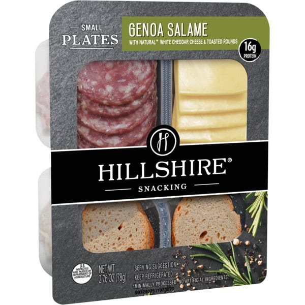 Hillshire Snacking Small Plates feature mild Genoa salami, natural white cheddar cheese, and crisp toasted rounds. Try pairing these snack plates with a fruity Bellini to enhance the flavors of the mild sliced salami and sharp white cheddar cheese slices. Perfectly portioned for snacking on the go, our Genoa Salami Small Plate has 16 grams of protein in each ready to eat serving.
