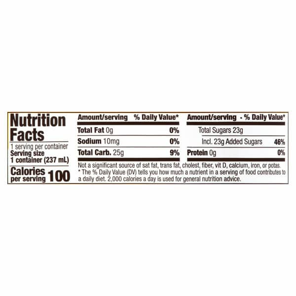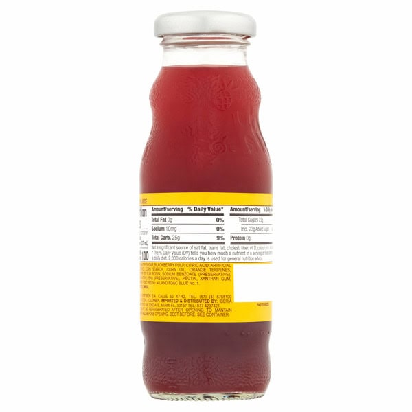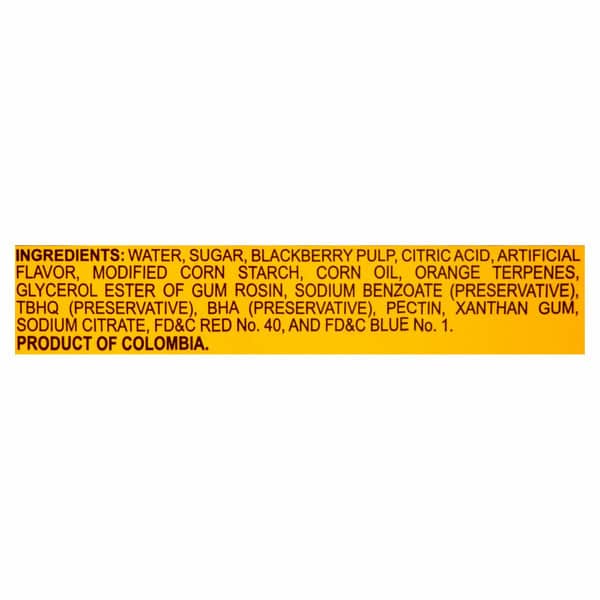 Water, Sugar, Blackberry Pulp, Citric Acid, Artificial Flavor, Modified Corn Starch, Corn Oil, Orange Terpenes, Glycerol Ester Of Gum Rosin, Sodium Benzoate (preservative), Tbhq (preservative), Bha (preservative), Pectin, Xanthan Gum, Sodium Citrate, Fd&c Red No. 40, Fd&c Blue No. 1