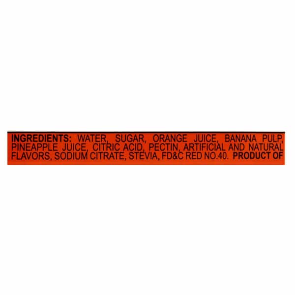 IngredientsWater, Sugar, Orange Juice, Banana Pulp, Pineapple Juice, Citric Acid, Pectin, Artificial And Natural Flavors, Sodium Citrate, Stevia, Fd&c Red No.40