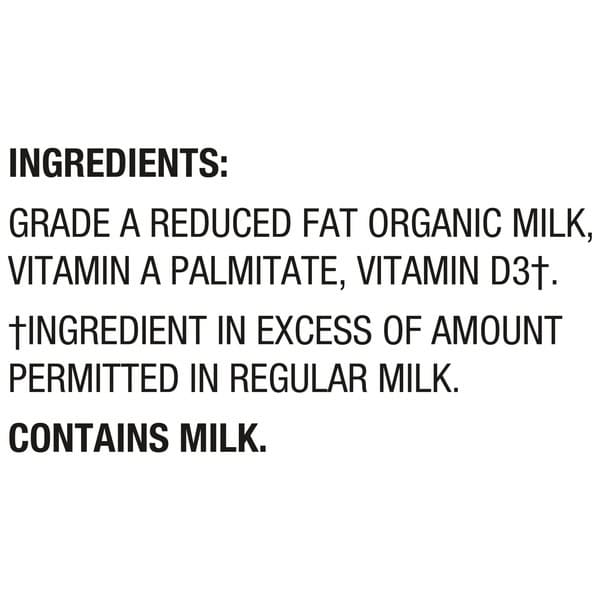 Grade A Reduced Fat Organic Milk, Vitamin A Palmitate, Vitamin D3†.