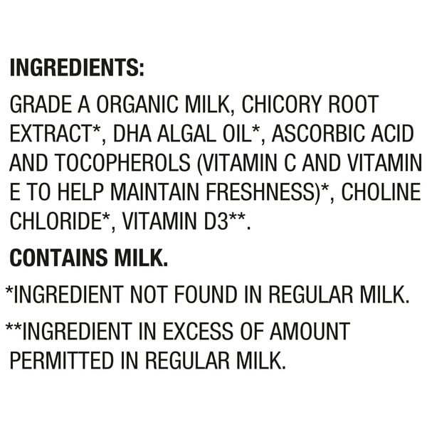 Grade A Organic Milk, Chicory Root Extract*, Dha Algal Oil*, Ascorbic Acid And Tocopherols (vitamin C And Vitamin E To Help Maintain Freshness)*, Choline Chloride* Vitamin D3**., *ingredient Not Found In Regular Milk. ** Ingredient In Excess Of Amount Permitted In Regular Milk