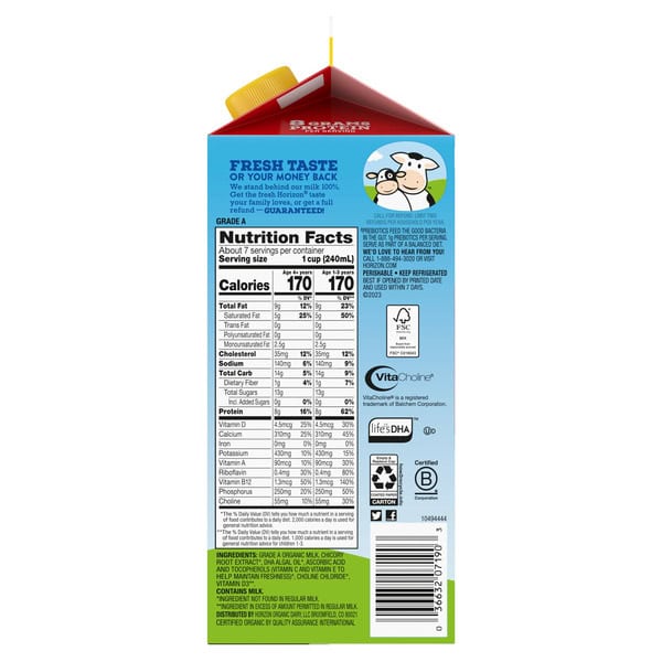 To create Horizon Growing Years organic milk, we partnered with pediatricians to identify key nutrients for growing kids, ages 1 to 5. Every delicious glass provides 50mg of DHA Omega-3 to help support brain health, a good source of choline to transport DHA in the body, as well as prebiotics that help feed good bacteria in the gut and high vitamin D and calcium for strong bones. Growing years helps deliver the nutrition kids need, in the great-tasting organic whole milk they love. Also, this certified USDA organic milk comes from happy cows raised by our trusted farmer partners, and it’s non-GMO, meaning it comes from cows that are pasture-raised* without antibiotics, toxic, persistent pesticides, or added hormones**.