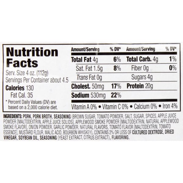 Pork, Pork Broth, Seasoning (brown Sugar, Tomato Powder, Salt, Sugar, Spices, Apple Juice Powder [maltodextrin, Apple Juice Solids], Applewood Smoke Powder [maltodextrin, Natural Applewood Smoke Flavor], Onion Powder, Garlic Powder, Natural Flavors, Tomato Flavor [maltodextrin, Tomato Essence], Mustard Flour, Malic Acid, Natural Smoke Flavor, Bourbon Whiskey), Contains 2% Or Less Of Dried Vinegar, Soybean Oil, Cultured Dextrose, Seasoning (yeast Extract, Citrus Extract), Flavoring