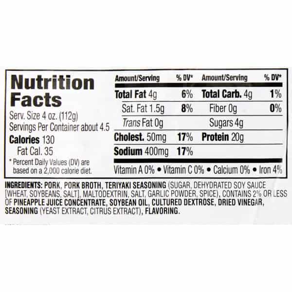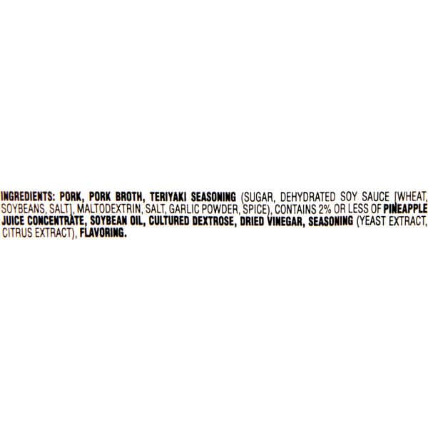 Pork, Pork Broth, Teriyaki Seasoning (sugar, Dehydrated Soy Sauce [wheat, Soybeans, Salt], Maltodextrin, Salt, Garlic Powder, Spice), Contains 2% Or Less Of Pineapple Juice Concentrate, Soybean Oil, Cultured Dextrose, Dried Vinegar, Seasoning (yeast Extract, Citrus Extract), Flavoring