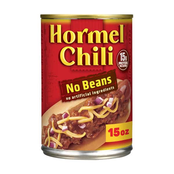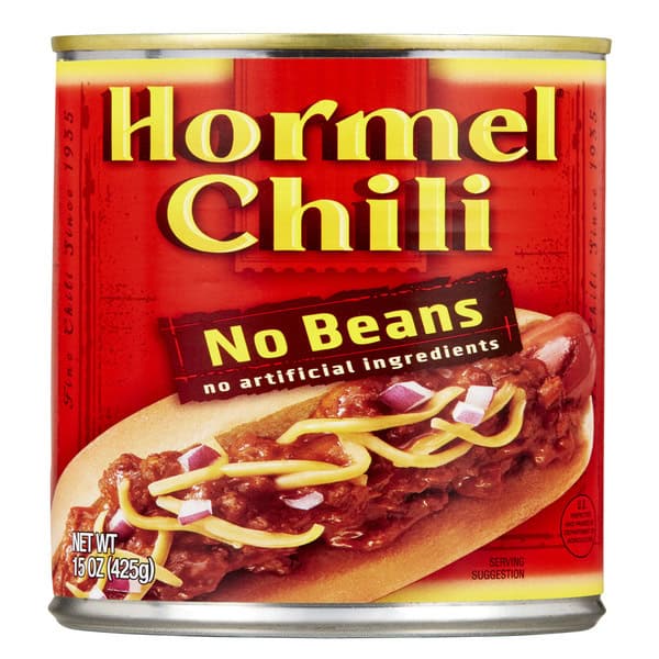 HORMEL Chili is everything you want chili to be: tender, savory meat cooked with flavorful spices to perfection! Bursting with meaty goodness – no beans in sight. It’s great for a quick, convenient meal you can heat, and serve! Works great on chili dogs, on chili sliders or over mac and cheese, too, so pour on the flavor! Add HORMEL Chili to enchiladas or stuffed bell peppers. The possibilities are endless! Our chili has 15 g of protein per serving and no artificial ingredients added. Contains twelve 15 oz aluminum cans of HORMEL Chili No Beans. HORMEL Chili makes an array of delicious chilis including with and without beans, less sodium, vegetarian, and with turkey, chicken or beef! No wonder it’s the #1 Selling Chili in America. (Based on the last 52 week IRI data). All trademarks, logos and images are owned by Hormel Foods Corporation, its subsidiaries and affiliates. Copyright Hormel Foods, LLC.