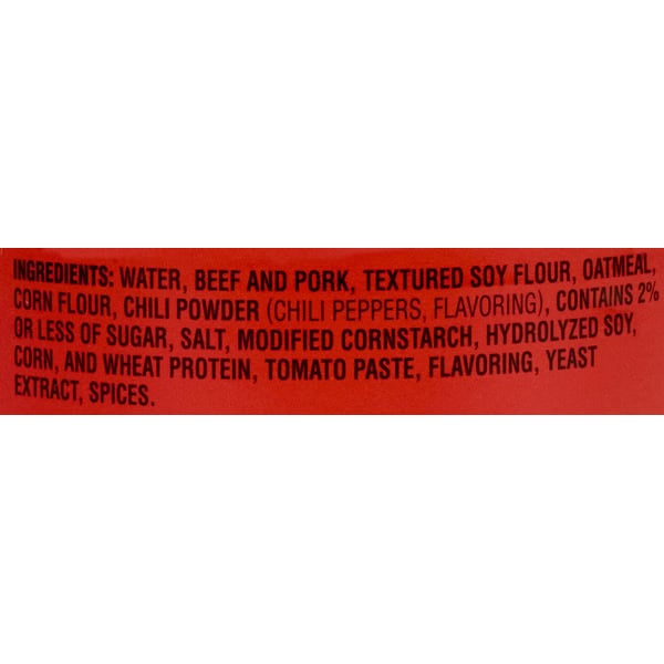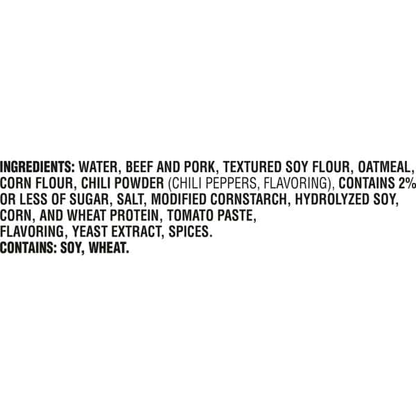 Water, Beef And Pork, Textured Soy Flour, Oatmeal, Corn Flour, Chili Powder (chili Peppers, Flavoring), Contains 2% Or Less Of Sugar, Salt, Modified Cornstarch, Hydrolyzed Soy, Corn, And Wheat Protein, Tomato Paste, Flavoring, Yeast Extract, Spices