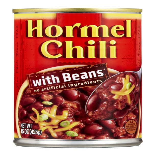 HORMEL Chili with Beans is everything you want chili to be: tender, savory meat, plump beans, flavorful spices slow cooked with tomatoes, jalapeños, onion and green chilis. Bursting with meaty goodness. An easy-pull top for quick, convenient meal prep, just pop the top, heat, and serve! Works great on chili dogs and mac and cheese, too, so pour on the flavor! More possibilities: add HORMEL Chili to enchiladas or stuffed bell peppers. Our chili has 17 g of protein per serving and no artificial ingredients added. Contains one 15 oz. can of HORMEL Chili with Beans. HORMEL Chili makes an array of delicious chilis including with and without beans, less sodium, vegetarian, and with turkey, chicken or beef! No wonder it’s the #1 Selling Chili in America. (Based on the last 52 week IRI data). Welcome to CHILI NATION. All trademarks, logos and images are owned by Hormel Foods Corporation, its subsidiaries and affiliates. Copyright Hormel Foods, LLC.