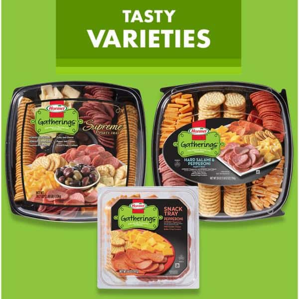HORMEL GATHERINGS Snack Tray Ham and Cheese is a lifesaver for any of your get-togethers, from birthdays and housewarming parties to pool parties and board meetings. All you have to do is open the tray and our individually-wrapped items and you have a party! That means less time prepping in the kitchen and more time with your family and friends. Honey ham, mild cheddar cheese, and butter crisp crackers: a tantalizing trio for all of your guests. Make it a party with HORMEL GATHERINGS party trays. Cut loose, not snacks. HORMEL GATHERINGS is a trademark of Hormel Foods, LLC.