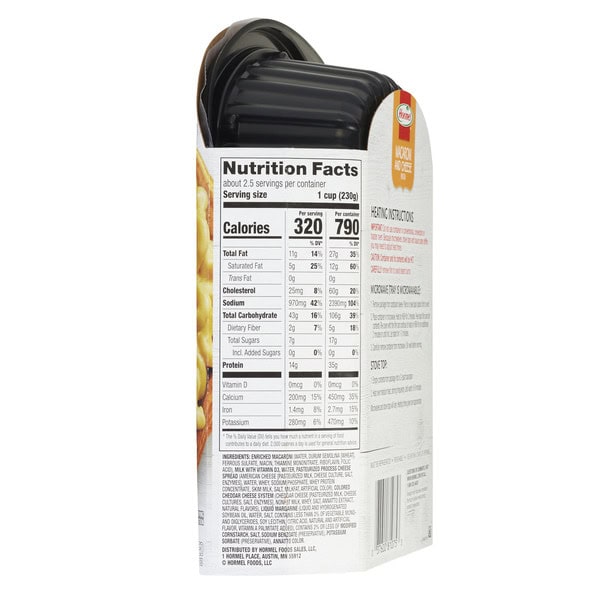 No matter how busy your schedule is, you can serve the ultimate comfort food without any of the preparation. HORMEL Macaroni and Cheese Pasta comes in an easy-to-heat container that warms in less than five minutes. This tasty meal or snack is rich and creamy and made with real American and Cheddar cheeses. Easily add this delicious side dish to your main course in an instant for a family favorite any day of the week. Whether you are preparing HORMEL Homestyle Meatloaf, pizza night for the kids, or hamburgers on the grill, this Macaroni and Cheese Pasta entree makes an easy and delicious addition to any lunch or dinner. It’s a ready-made dish for the whole family, that can be prepared quickly and enjoyed by everyone. All trademarks, logos and images are owned by Hormel Foods Corporation, its subsidiaries and affiliates. Copyright Hormel Foods, LLC.