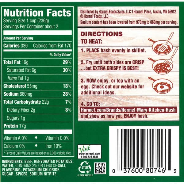 Fill your family’s breakfast table with the timeless home-cooked flavor of HORMEL MARY KITCHEN Reduced Sodium Corned Beef Hash. Made with a delicious mix of tender corned beef chunks, diced potatoes, and savory seasonings, and 25% less sodium than our regular hash, it’s never been easier to bring the restaurant flavor you love to your home and enjoy an easy breakfast or relaxing brunch with your friends and family. It is a shelf stable, pantry staple. With 17 grams of protein per serving, you can add this corned beef hash to recipes like egg muffins, omelets, potatoes, and more for even more flavor. For over 65 years we have been delivering high quality food with great taste with HORMEL MARY KITCHEN hash (Based on latest 52 week IRI data.) Experience the taste of America’s #1 selling hash. Includes one 14 oz steel can of HORMEL MARY KITCHEN Reduced Sodium Corned Beef Hash. All trademarks, logos and images are owned by Hormel Foods Corporation, its subsidiaries and affiliates. Copyright Hormel Foods, LLC.