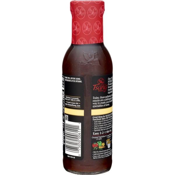 HOUSE OF TSANG Spicy Szechuan Stir-Fry Sauce is a blend of hot peppers, onions, ginger, and garlic, Cantonese style. Show off your creativity in the kitchen with a product line built on the ideals of authentic Asian flavors. With a bit of sweet and a bit of spice, your dishes will sing the praises of Szechuan cooking and bring that authentic restaurant flavor to your home. Spicy Szechuan sauce as a marinade for the grill or use it as a dipping sauce for chicken wings. Making your next meal with HOUSE OF TSANG sauces is a breeze. Simply add your cooked protein, veggies, and stir in Szechuan sauce for a sweet and spicy taste. With HOUSE OF TSANG shelf stable sauces, you’re always 3 easy steps from your tasty place. Includes one 11.5 oz glass bottle of HOUSE OF TSANG Spicy Szechuan Stir-Fry Sauce. All trademarks, logos and images are owned by Hormel Foods Corporation, its subsidiaries and affiliates. Copyright Hormel Foods, LLC.