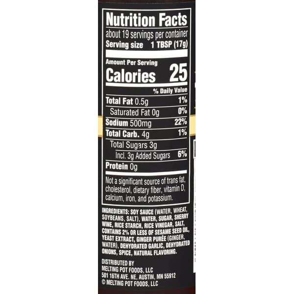 Soy Sauce (water, Wheat, Soybeans, Salt), Water, Sugar, Sherry Wine, Rice Starch, Rice Vinegar, Salt, Contains 2% Or Less Of Sesame Seed Oil, Yeast Extract, Ginger Purée (ginger, Water), Dehydrated Garlic, Dehydrated Onions, Spice, Natural Flavoring