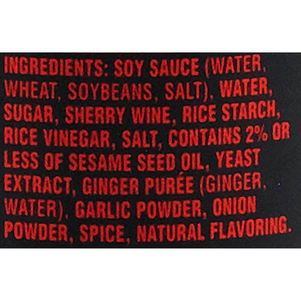 Soy Sauce (water, Wheat, Soybeans, Salt), Water, Sugar, Sherry Wine, Rice Starch, Rice Vinegar, Salt, Contains 2% Or Less Of Sesame Seed Oil, Yeast Extract, Ginger Purée (ginger, Water), Dehydrated Garlic, Dehydrated Onions, Spice, Natural Flavoring
