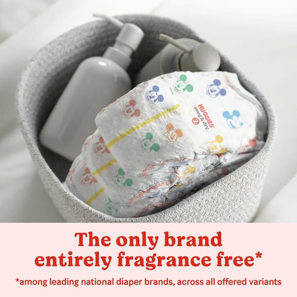 Parenting might be hard, but thanks to Huggies Snug & Dry Baby Diapers, diapering doesn’t have to be. As the only leading brand that is entirely fragrance free,* Snug & Dry newborn diapers are made to be free of fragrances, added lotions, parabens and natural rubber latex. When it comes to keeping your baby dry, Snug & Dry diapers are there for you even in messy situations. Our Snug & Dry infant diapers are up to 100% leak proof, even from blowouts. Made with the original Leak Lock blowout blocker, Snug & Dry baby diapers help protect against blowouts and ensuing messes. Additionally, these diapers are designed with a curved and stretchy fit for outstanding leakage protection. Made to help your baby live their best life, our infant diapers feature 2X comfort design to provide outstanding softness and gentle protection. An added wetness indicator changes colors when the diaper is wet, allowing you to know right when the diaper needs to be changed. Featuring exclusive Disney designs, Huggies Snug & Dry Diapers are available in size Newborn (6-9 lb.), size 1 (8-14 lb.), size 2 (12-18 lb.), size 3 (16-28 lb.), size 4 (22-37 lb.), size 5 (27+ lb.), size 6 (35+ lb.), size 7 (41+ lb.) and size 8 (46+ lb.).(*among leading national diaper brands, across all offered variants) (**among branded open diapers. Excludes preemie size.)