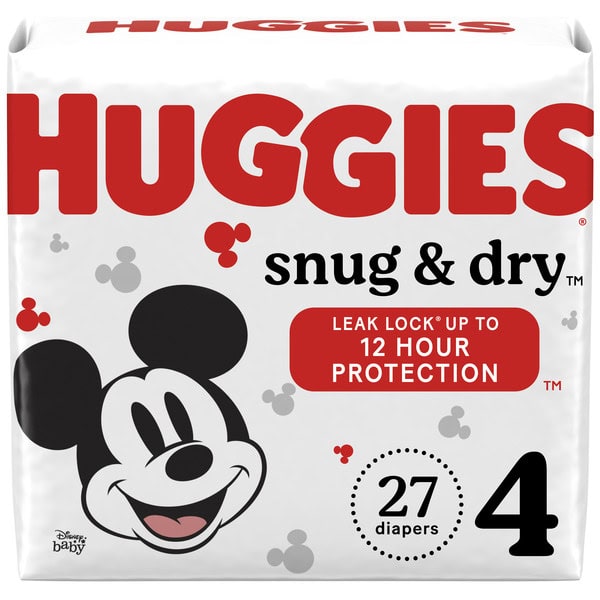 • Huggies Snug & Dry Diapers: 27 baby diapers, size 4 (22-37 lbs)