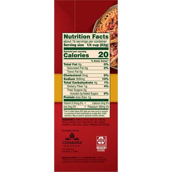Tomato Puree (water, Tomato Paste), Water, Less Than 2% Of: Salt, Onion Powder, Citric Acid, Garlic Powder, Red Pepper.