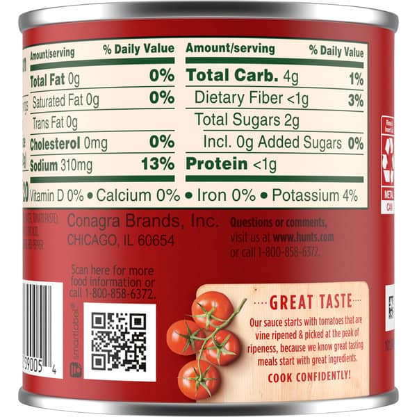 Get cooking with Hunt’s Tomato Sauce. Made with all-natural, vine-ripened tomatoes simmered with salt, spices and natural flavors for seasoning, this tomato sauce is a flavorful addition to any recipe. From soups, glazes, pizza sauces and pasta sauces, Hunt’s Tomato Sauce is a trusted start to easy and delicious meals. 100% natural, this tomato pasta sauce is Non-GMO Project Verified and contains no added sugar, corn syrup or other sweeteners. with no artificial preservatives or ingredients, you can trust this red sauce as an ideal way to elevate meals for your family. Use this smooth tomato sauce in casseroles, soups or as a spaghetti sauce. Ready when you need it, this canned tomato sauce is a pantry staple. Keep it on hand for canned goods with delicious flavor. Great meals start with Hunt’s​.