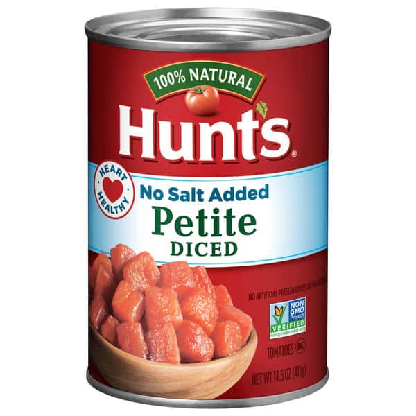 • No compromise, Hunt’s Petite Diced Tomatoes No Salt Added are 100% natural, with no artificial preservatives