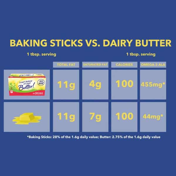 Replace dairy butter 1:1 in baking with less saturated fat and more Omega-3 ALA per serving by using I Can’t Believe It’s Not Butter! Baking Sticks, 16 oz! This delicious alternative to dairy butter is made with good fats from plant-based oils and is rich in Omega-3 ALA. In fact, each 1 tbsp. serving contains 455 mg of Omega-3 ALA (28% of the 1.6g daily value) vs. dairy butter’s 44mg of omega-3 ALA per 1 tbsp. serving (1.1% of the 1.6g daily value).