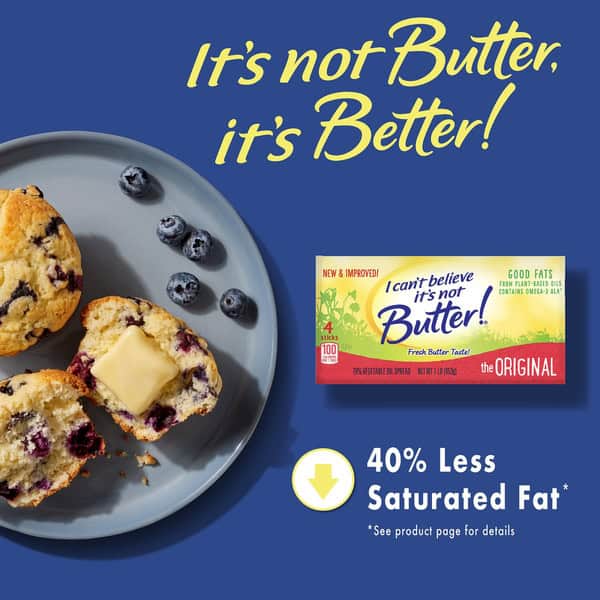 • READY TO USE: I Can’t Believe It’s Not Butter! baking sticks don’t need to be softened or melted before spreading or use in baking.