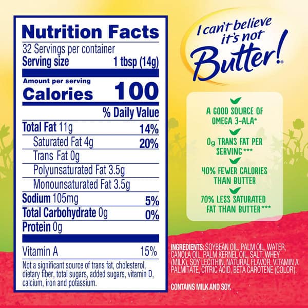 • PLANT-BASED OILS: buttery goodness made with good fats from plant-based oils including soybean and palm.