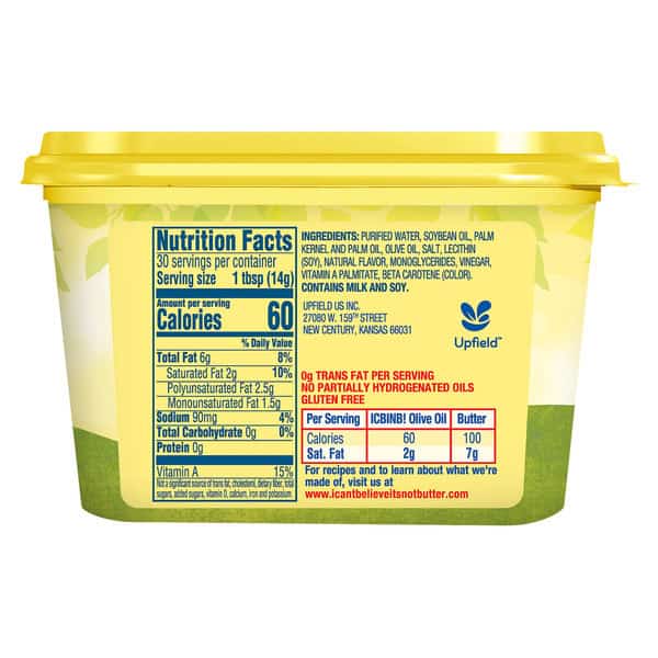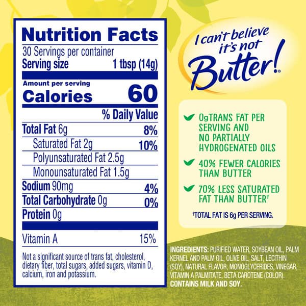 I Can’t Believe It’s Not Butter! Olive Oil is made with good fats from plant-based oils and contains omega-3 ALA.* Made with real, simple ingredients, including olive oil, a delicious blend of plant-based oils, purified water, and a pinch of salt. I Can’t Believe It’s Not Butter! Olive Oil has an amazing fresh butter taste with zero cholesterol per serving. This irresistibly creamy spread contains no artificial flavors, no artificial preservatives, no partially hydrogenated oils and 0 grams trans-fat. It has only 60 calories per serving and 70% less saturated fat than butter. **