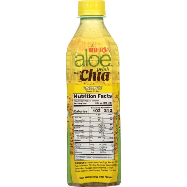 Filtered Water, Cane Sugar, Aloe Vera Pulp, Chia Seeds, Citric Acid, Flavorings, Calcium Lactate, Gellan Gum, Pineapple Juice Concentrate, Sodium Citrate, Vitamin C, Beta Carotene.