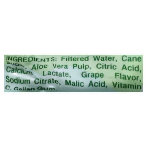 Filtered Water, Cane Sugar, Aloe Vera Pulp, Citric Acid, Calcium Lactate, Grape Flavor, Sodium Citrate, Malic Acid, Vitamin C, Gellan Gum.