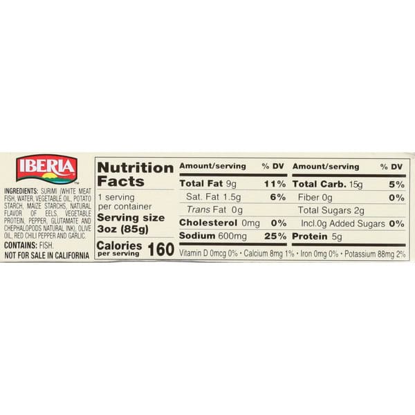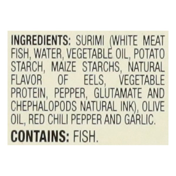 Surimi (White Wheat Fish, Water, Vegetable Oil, Potato Starch, Maize Starch, Natural Flavor of Eels, Vegetable Protein, Pepper, Glutamate, and Cephalopods Natural Ink), Olive Oil, Red Chili Pepper, and Garlic.