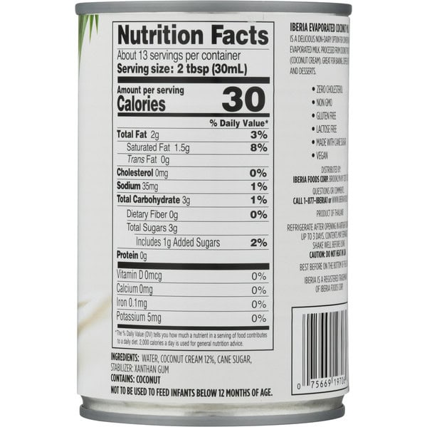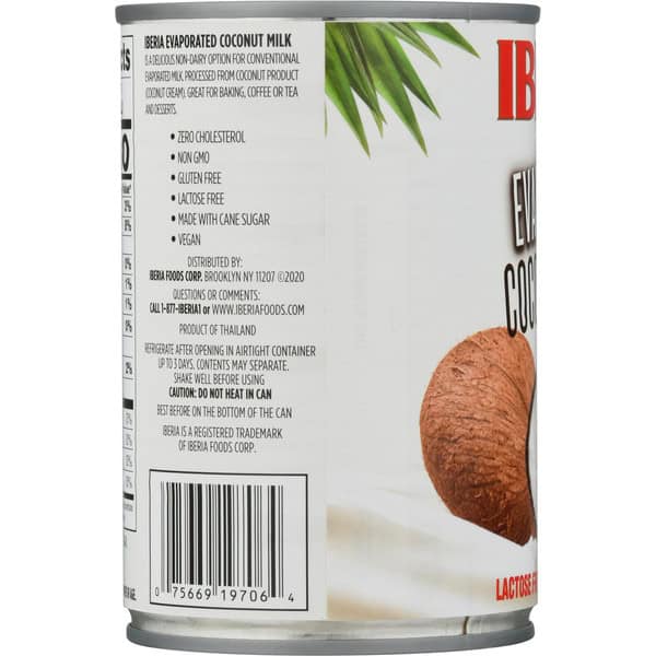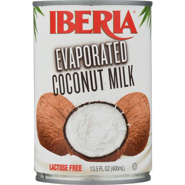 Iberia evaporated coconut milk is a delicious non-dairy option for conventional evaporated milk. Processed from coconut product (coconut cream). Great for baking, coffee or tea and desserts.