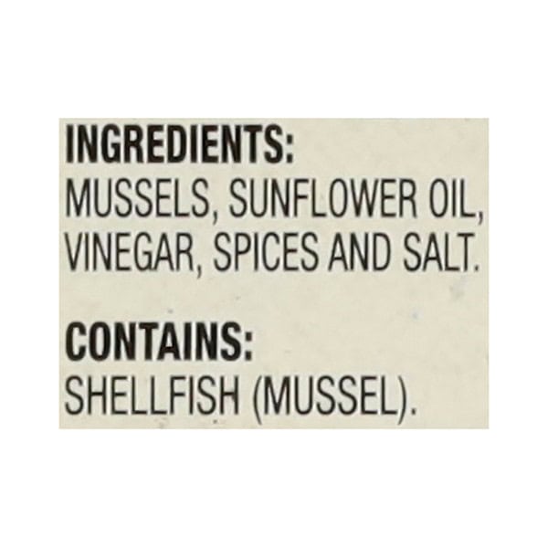 Mussels, Sunflower Oil, Vinegar, Spices and Salt.