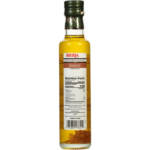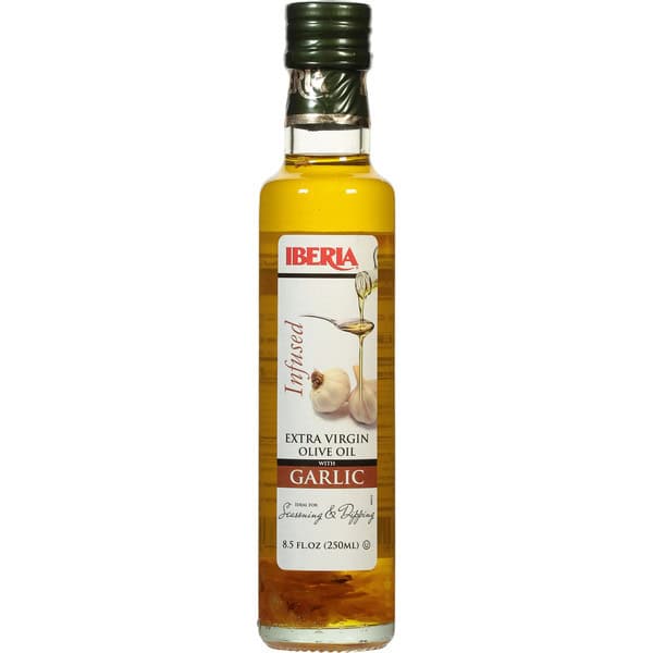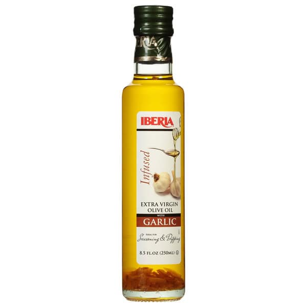 Iberia Infused Extra Virgin Olive Oil with Garlic combines the rich, smooth taste of cold-pressed olive oil with the bold flavor of garlic. Perfect for drizzling over pasta, meats, and vegetables, this 8.5 fl oz bottle adds a savory touch to marinades, sauces, and everyday cooking.