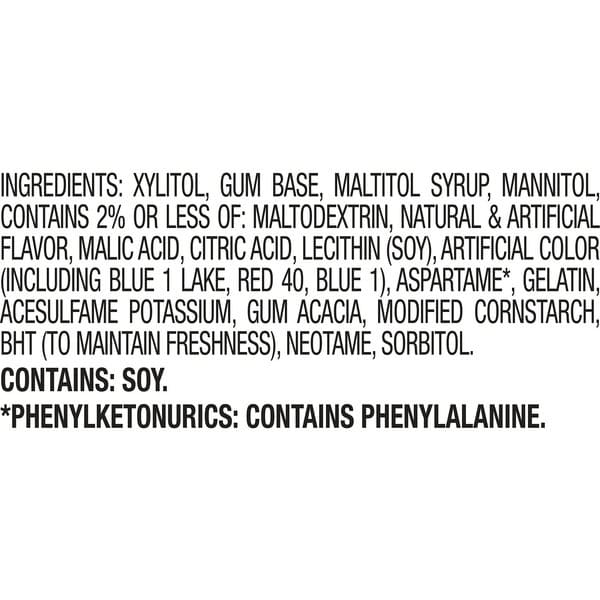 Xylitol, Gum Base, Maltitol Syrup, Mannitol Contains 2% Or Less Of: Maltodextrin, Natural & Artificial Flavor, Malic Acid, Citric Acid, Lecithin (soy), Artificial Color (including Blue 1 Lake, Red 40, Blue 1), Aspartame *, Gelatin Acesulfame Potassium, Gum Acacia, Modified Cornstarch Bht (to Maintain Freshness), Neotame, Sorbitol.