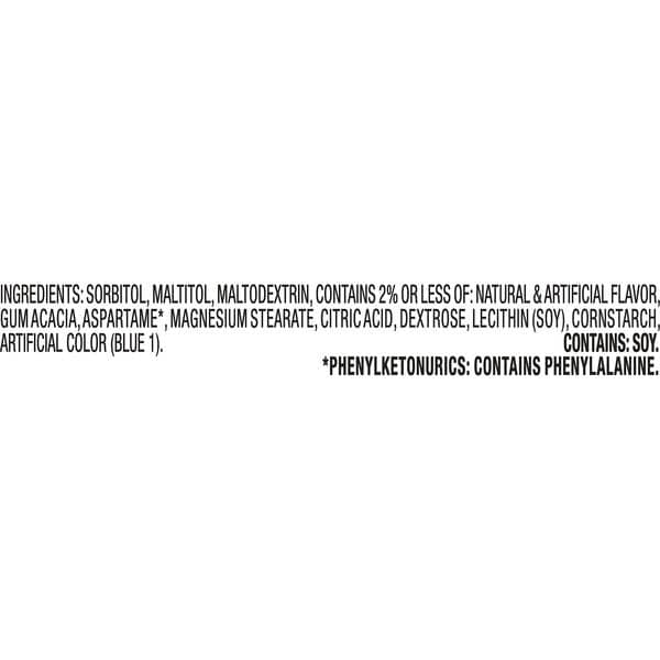 Sorbitol; Maltitol; Maltodextrin; Contains 2% Or Less Of: Natural Flavor And Artificial Flavor; Gum Acacia; Aspartame*; Magnesium Stearate; Citric Acid; Lecithin (soy); Artificial Color [blue 1].