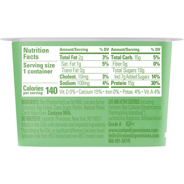 Skyr (pasteurized Low Fat Milk, Live And Active Cultures), Key Limes, Cane Sugar, Pectin, Natural Flavor, Carob Bean Gum