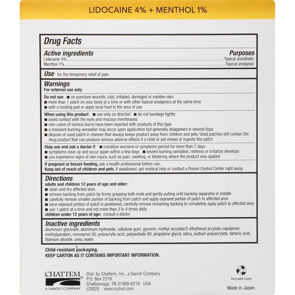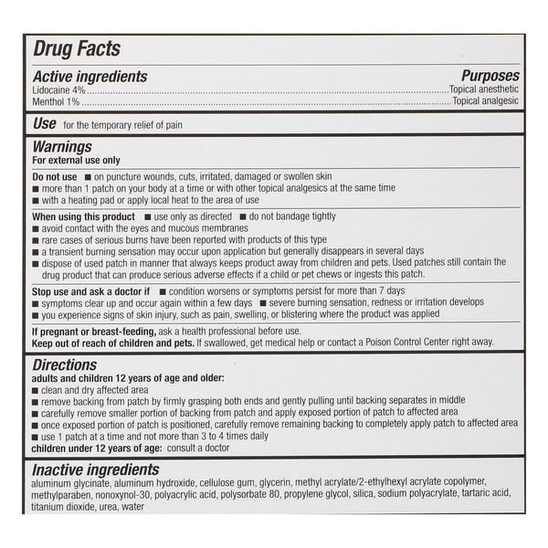 Keep out of reach of children and pets. If swallowed, get medical help or contact a poison control center right away. When using this product – use only as directed. Read and follow all directions and warnings on this carton. Rare cases of serious burns have been reported with products of this type, do not apply to wounds or damaged, broken or irritated skin, do not allow contact with the eyes and mucous membranes, do not bandage tightly or apply local heat (such as heating pads) to the area of use, do not use at the same time as other topical analgesics, dispose of used patch in manner that always keeps product away from children and pets. Used patches still contain the drug product that can produce serious adverse effects if a child or pet chews or ingests this patch. Do not use – more than 1 patch on your body at a time or on cut, irritated or swollen skin, on puncture wounds, for more than one week without consulting a doctor. If pregnant or breast-feeding, ask a health professional before use. Stop use and ask a doctor if – condition worsens, redness is present, irritation develops, symptoms persist for more than 7 days or clear up and occur again within a few days, you experience signs of skin injury, such as pain, swelling, or blistering where the product was applied. For external use only.