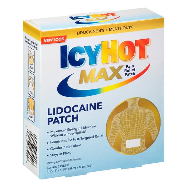 New look. Maximum strength Lidocaine without a prescription (Among OTC topical analgesic). Penetrates for fast, targeted relief. Comfortable fabric. Stays in place. Contains 5 patches. Numbs away pain. Back. Neck & shoulders. Knee & elbow. Ankle & leg. Recyclable carton.