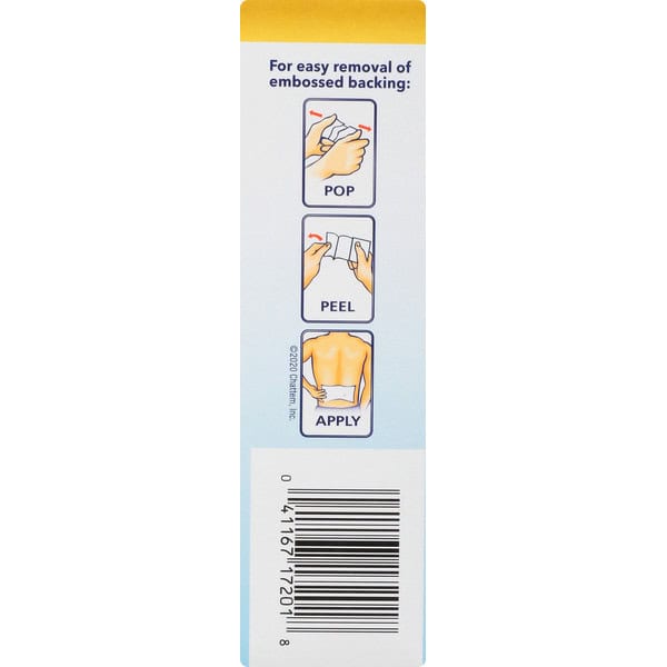 Directions: Keep carton as it contains important information. For easy removal of embossed backing. Pop. Peel. Apply. Adults and Children 12 Years of Age and Older: Clean and dry affected area. Remove backing from patch by firmly grasping both ends and gently pulling until backing separates in middle. Carefully remove smaller portion of backing from patch and apply exposed portion of patch to affected area. Once exposed portion of patch is positioned, carefully remove remaining backing to completely apply patch to affected area. Use 1 patch at a time and not more than 3 to 4 times daily. Children Under 12 Years of Age: Consult a doctor.