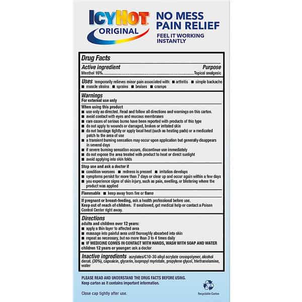 Feel it working instantly. Powerful pain relief for muscles and joints. Icy to dull, hot to relax. Quick-dry formula. Rise from pain. Targeted Relief for: Simple backache; muscle strains; arthritis; bruises. Recyclable carton.