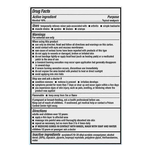 Flammable keep away from fire or flame . If pregnant or breast-feeding, ask a health professional before use. Keep out of reach of children. If swallowed, get medical help or contact a Poison Control Center right away. Stop use and ask a doctor if condition worsens redness is present irritation develops symptoms persist for more than 7 days or clear up and occur again within a few days you experience signs of skin injury, such as pain, swelling, or blistering where the product was applied. When using this product use only as directed. Read and follow all directions and warnings on this carton. rare cases of serious burns have been reported with products of this type do not bandage tightly or apply local heat (such as heating pads) or a medicated patch to the area of use avoid contact with eyes and mucous membranes do not apply to wounds or damaged, broken or irritated skin a transient burning sensation may occur upon application but generally disappears in several days if severe burning sensation occurs, discontinue use immediately do not expose the area treated with product to heat or direct sunlight avoid applying into skin folds. For external use only.